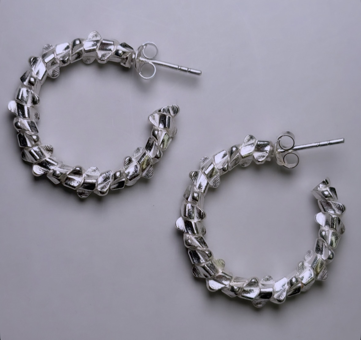 Pure silver open end hoops with sterling silver posts. Handmade in the hill-tribe region of Thailand.