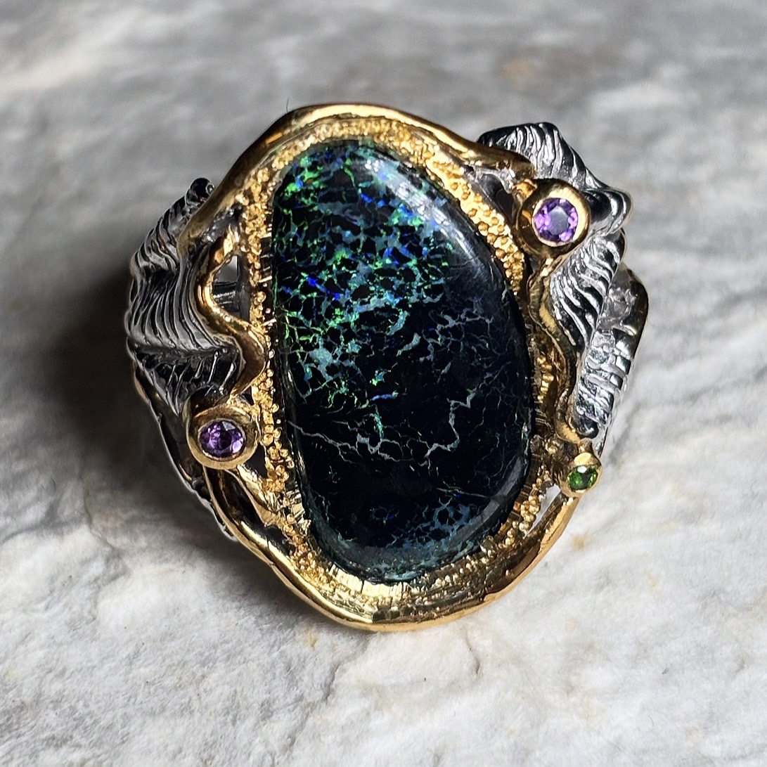 One of a kind ring handmade with an Andamooka Matrix Opal, 2 small Amethyst stones, and 1 Peridot stone.