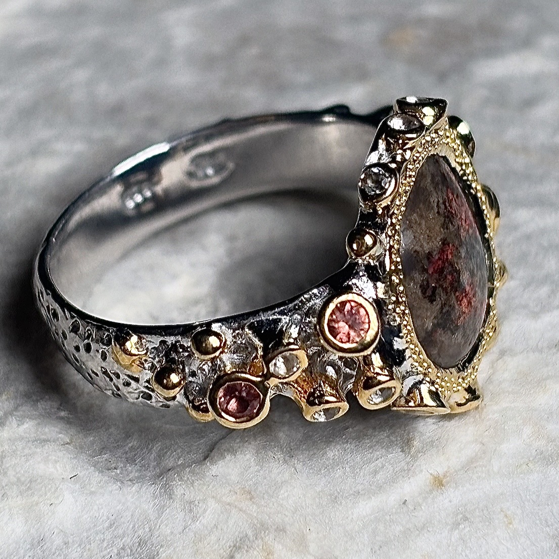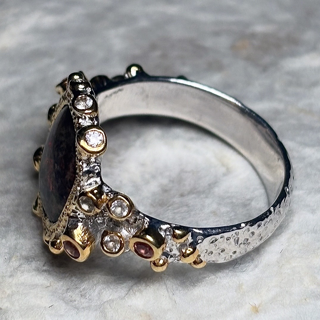 One of a kind handmade ring with a Matrix Opal, small 4 Orange Sapphire stones, and 12 White Topaz stones.
