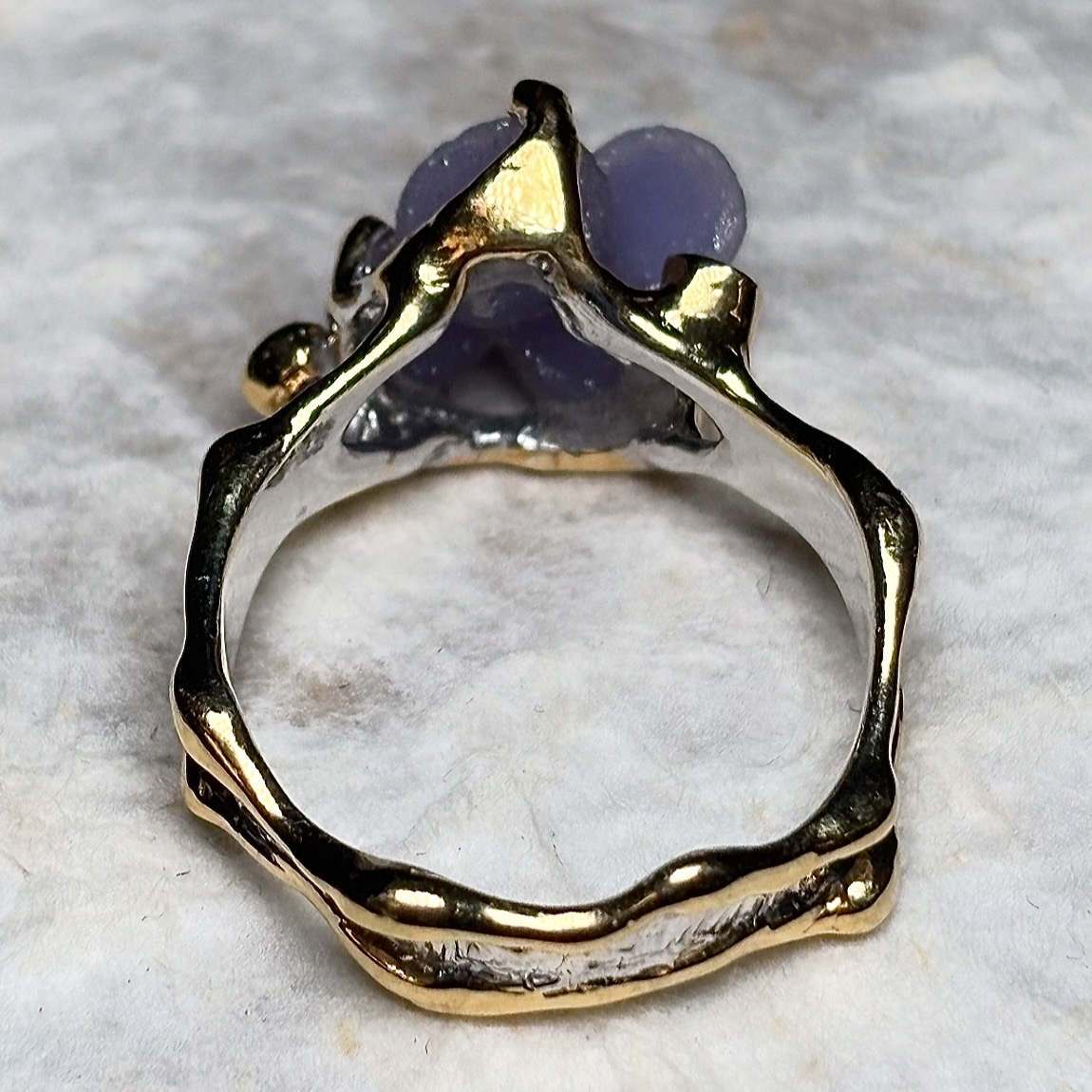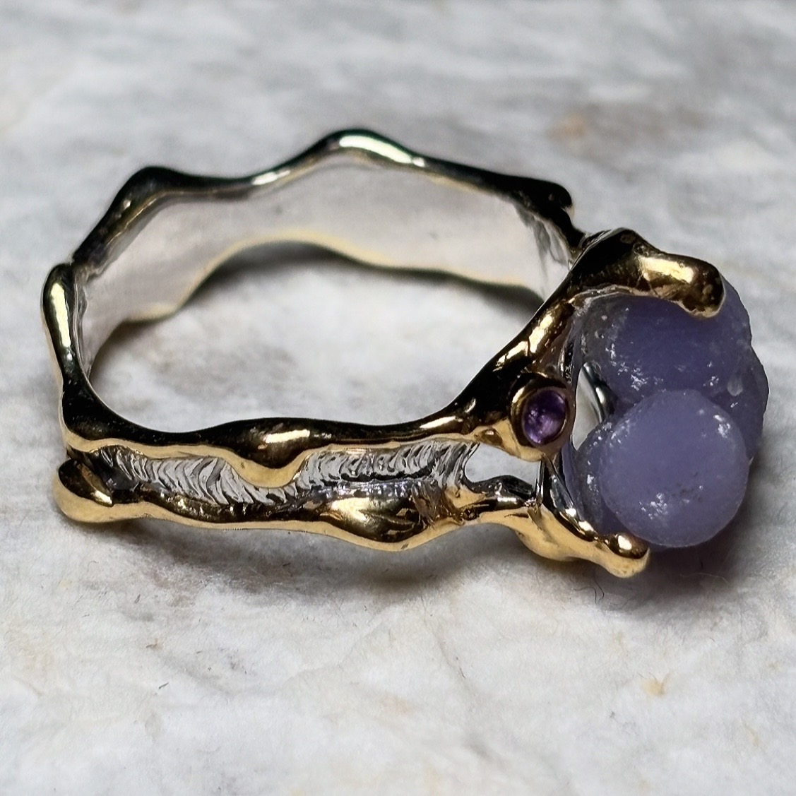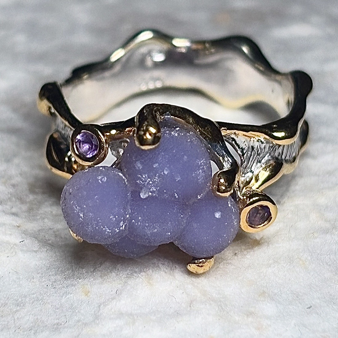 One of a kind handmade ring with a Manakara Grape Druzy stone and 2 small Amethyst stones.